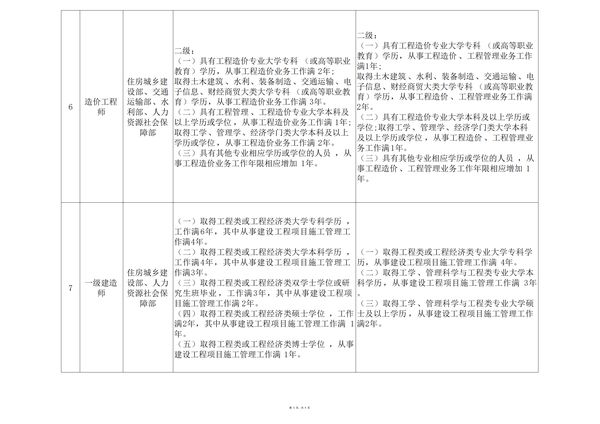 (一)具有各工程大類**大學??茖W歷(或高等職業(yè)教育),從事工程施工、監(jiān)理、設計等業(yè)務工作滿6年。(二)具有工學、管理科學與工程類**大學本科學歷或學位,從事工程施工、監(jiān)理、設計等業(yè)務工作滿4年。(三)具有工學、管理科學與工程一級學科碩士學位或**學位,從事工程施工、監(jiān)理、設計等業(yè)務工作滿2年。經(jīng)批準同意開展試點的地區(qū),申請參加監(jiān)理工程師職業(yè)資格考試的,應當具有大學本科及以上學歷或學位。(一)具有各工程大類**大學專科學歷(或高等職業(yè)教育),從事工程施工、監(jiān)理、設計等業(yè)務工作滿4年。(二)具有工學、管理科學與工程類**大學本科學歷或學位,從事工程施工、監(jiān)理、設計等業(yè)務工作滿3年。(三)具有工學、管理科學與工程一級學科碩士學位或**學位,從事工程施工、監(jiān)理、設計等業(yè)務工作滿2年。經(jīng)批準同意開展試點的地區(qū),申請參加監(jiān)理工程師職業(yè)資格考試的,應當具有大學本科及以上學歷或學位。(一)具有工程造價**大學專科(或高等職業(yè)教育)學歷,從事工程造價業(yè)務工作滿5年; 取得土木建筑、水利、裝備制造、交通運輸、電子信息、財經(jīng)商貿(mào)大類大學專科(或高等職業(yè)教育)學歷,從事工程造價業(yè)務工作滿6年。 (二)具有通過工程教育**評估(認證)的工程管理、工程造價**大學本科學歷或學位,從事工程造價業(yè)務工作滿4年;具有工學類、管理學類、經(jīng)濟學門類大學本科學歷或學位,從事工程造價業(yè)務工作滿5年。(三)具有工學、管理學、經(jīng)濟學門類碩士學位或者第二學士學位,從事工程造價業(yè)務工作滿3年。 (四)具有工學、管理學、經(jīng)濟學門類博士學位,從事工程造價業(yè)務工作滿1年。 (五)具有其他**相應學歷或者學位的人員,從事工程造價業(yè)務工作年限相應增加1年。 (一)具有工程造價**大學專科(或高等職業(yè)教育)學歷,從事工程造價、工程管理業(yè)務工作滿4年; 取得土木建筑、水利、裝備制造、交通運輸、電子信息、財經(jīng)商貿(mào)大類大學??疲ɑ蚋叩嚷殬I(yè)教育)學歷,從事工程造價、工程管理業(yè)務工作滿5年。 (二)具有工程造價、通過工程教育**評估(認證)的工程管理**大學本科學歷或學位,從事工程造價、工程管理業(yè)務工作滿3年;具有工學類、管理學類、經(jīng)濟學門類大學本科學歷或學位,從事工程造價、工程管理業(yè)務工作滿4年。 (三)具有工學、管理學、經(jīng)濟學門類碩士學位或者第二學士學位,從事工程造價、工程管理業(yè)務工作滿2年。 (四)具有工學、管理學、經(jīng)濟學門類博士學位。 (五)具有其他**相應學歷或者學位的人員,從事工程造價、工程管理業(yè)務工作年限相應增加1年。 (一)取得工程類或工程經(jīng)濟類大學??茖W歷,工作滿6年,其中從事建設工程項目施工管理工作滿4年。(二)取得工程類或工程經(jīng)濟類大學本科學歷,工作滿4年,其中從事建設工程項目施工管理工作滿3年。(三)取得工程類或工程經(jīng)濟類雙學士學位或研究生班畢業(yè),工作滿3年,其中從事建設工程項目施工管理工作滿2年。(四)取得工程類或工程經(jīng)濟類碩士學位,工作滿2年,其中從事建設工程項目施工管理工作滿1年。(五)取得工程類或工程經(jīng)濟類博士學位,從事建設工程項目施工管理工作滿1年。(一)取得工程類或工程經(jīng)濟類**大學專科學歷,從事建設工程項目施工管理工作滿4年。(二)取得工學、管理科學與工程類**大學本科學歷,從事建設工程項目施工管理工作滿3年。(三)取得工學、管理科學與工程類**大學碩士及以上學歷,從事建設工程項目施工管理工作滿2年。