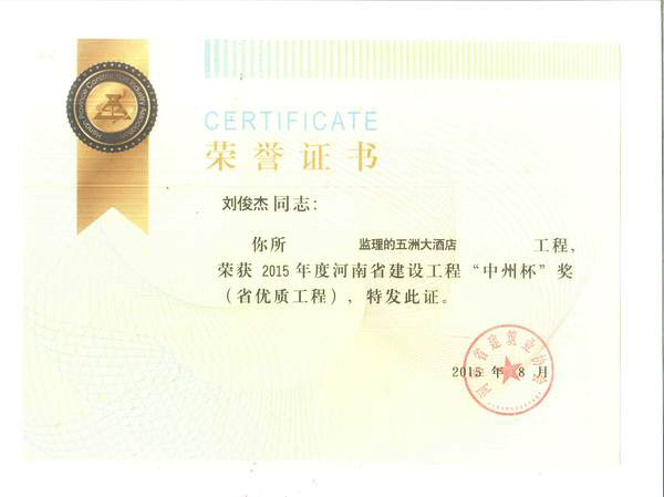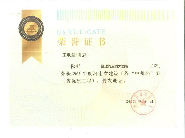 熱烈祝賀我公司監(jiān)理的五洲大酒店項(xiàng)目榮獲2015年度河南省建設(shè)工程“中州杯”獎(jiǎng)(省優(yōu)質(zhì)工程),總監(jiān)宋電君,監(jiān)理工程師劉俊杰。