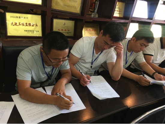 2019年7月6日上午河南省新源建設(shè)工程管理有限公司全體監(jiān)理人員在公司三樓會(huì)議室進(jìn)行2019上半年業(yè)務(wù)考試,**提升監(jiān)理人員的業(yè)務(wù)素質(zhì)和技術(shù)水平。