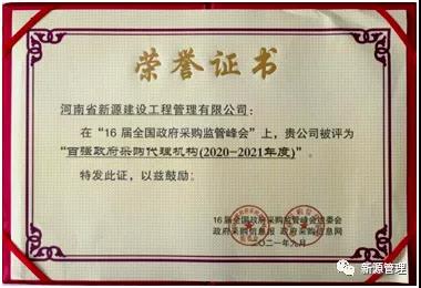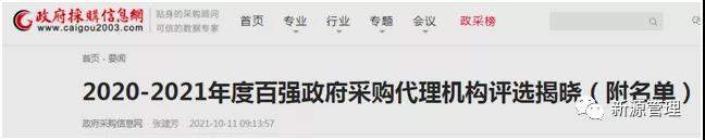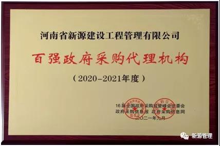 喜報|河南新源公司榮獲國家級榮譽“百強政府采購代理機構(gòu)(2020-2021年度)”