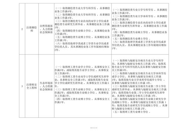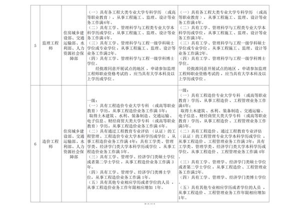 (一)具有各工程大類**大學??茖W歷(或高等職業(yè)教育),從事工程施工、監(jiān)理、設計等業(yè)務工作滿6年。(二)具有工學、管理科學與工程類**大學本科學歷或學位,從事工程施工、監(jiān)理、設計等業(yè)務工作滿4年。(三)具有工學、管理科學與工程一級學科碩士學位或**學位,從事工程施工、監(jiān)理、設計等業(yè)務工作滿2年。經(jīng)批準同意開展試點的地區(qū),申請參加監(jiān)理工程師職業(yè)資格考試的,應當具有大學本科及以上學歷或學位。(一)具有各工程大類**大學專科學歷(或高等職業(yè)教育),從事工程施工、監(jiān)理、設計等業(yè)務工作滿4年。(二)具有工學、管理科學與工程類**大學本科學歷或學位,從事工程施工、監(jiān)理、設計等業(yè)務工作滿3年。(三)具有工學、管理科學與工程一級學科碩士學位或**學位,從事工程施工、監(jiān)理、設計等業(yè)務工作滿2年。經(jīng)批準同意開展試點的地區(qū),申請參加監(jiān)理工程師職業(yè)資格考試的,應當具有大學本科及以上學歷或學位。(一)具有工程造價**大學專科(或高等職業(yè)教育)學歷,從事工程造價業(yè)務工作滿5年; 取得土木建筑、水利、裝備制造、交通運輸、電子信息、財經(jīng)商貿(mào)大類大學專科(或高等職業(yè)教育)學歷,從事工程造價業(yè)務工作滿6年。 (二)具有通過工程教育**評估(認證)的工程管理、工程造價**大學本科學歷或學位,從事工程造價業(yè)務工作滿4年;具有工學類、管理學類、經(jīng)濟學門類大學本科學歷或學位,從事工程造價業(yè)務工作滿5年。(三)具有工學、管理學、經(jīng)濟學門類碩士學位或者第二學士學位,從事工程造價業(yè)務工作滿3年。 (四)具有工學、管理學、經(jīng)濟學門類博士學位,從事工程造價業(yè)務工作滿1年。 (五)具有其他**相應學歷或者學位的人員,從事工程造價業(yè)務工作年限相應增加1年。 (一)具有工程造價**大學專科(或高等職業(yè)教育)學歷,從事工程造價、工程管理業(yè)務工作滿4年; 取得土木建筑、水利、裝備制造、交通運輸、電子信息、財經(jīng)商貿(mào)大類大學??疲ɑ蚋叩嚷殬I(yè)教育)學歷,從事工程造價、工程管理業(yè)務工作滿5年。 (二)具有工程造價、通過工程教育**評估(認證)的工程管理**大學本科學歷或學位,從事工程造價、工程管理業(yè)務工作滿3年;具有工學類、管理學類、經(jīng)濟學門類大學本科學歷或學位,從事工程造價、工程管理業(yè)務工作滿4年。 (三)具有工學、管理學、經(jīng)濟學門類碩士學位或者第二學士學位,從事工程造價、工程管理業(yè)務工作滿2年。 (四)具有工學、管理學、經(jīng)濟學門類博士學位。 (五)具有其他**相應學歷或者學位的人員,從事工程造價、工程管理業(yè)務工作年限相應增加1年。 (一)取得工程類或工程經(jīng)濟類大學??茖W歷,工作滿6年,其中從事建設工程項目施工管理工作滿4年。(二)取得工程類或工程經(jīng)濟類大學本科學歷,工作滿4年,其中從事建設工程項目施工管理工作滿3年。(三)取得工程類或工程經(jīng)濟類雙學士學位或研究生班畢業(yè),工作滿3年,其中從事建設工程項目施工管理工作滿2年。(四)取得工程類或工程經(jīng)濟類碩士學位,工作滿2年,其中從事建設工程項目施工管理工作滿1年。(五)取得工程類或工程經(jīng)濟類博士學位,從事建設工程項目施工管理工作滿1年。(一)取得工程類或工程經(jīng)濟類**大學專科學歷,從事建設工程項目施工管理工作滿4年。(二)取得工學、管理科學與工程類**大學本科學歷,從事建設工程項目施工管理工作滿3年。(三)取得工學、管理科學與工程類**大學碩士及以上學歷,從事建設工程項目施工管理工作滿2年。